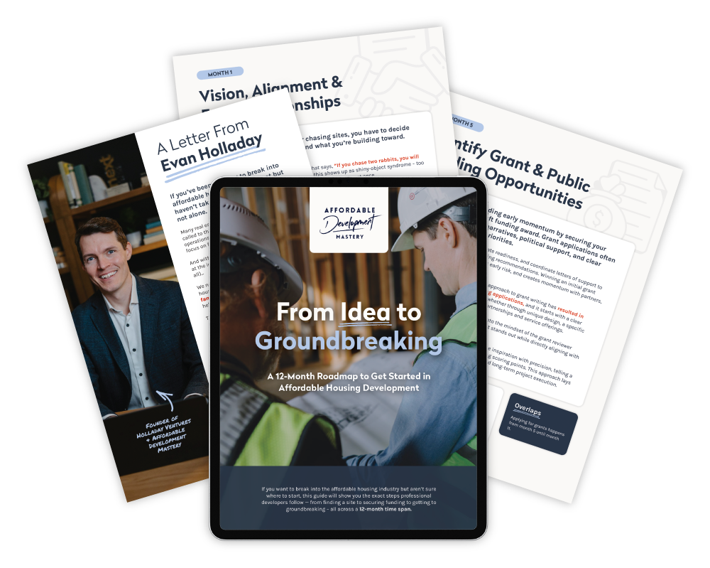 If you want to break into the affordable housing industry but aren’t sure where to start, this guide from Evan Holladay will show you the exact steps affordable housing developers follow — from finding a site to securing funding to getting to groundbreaking – all across a 12-month time span.