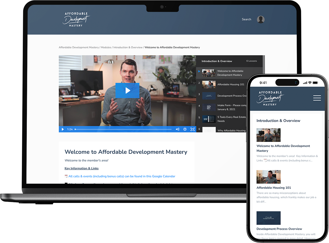 12-Part Affordable Development Curriculum – A step-by-step roadmap that walks you through everything from finding the right site and capital stack to managing approvals and scaling your projects. ($25,000 Value)
